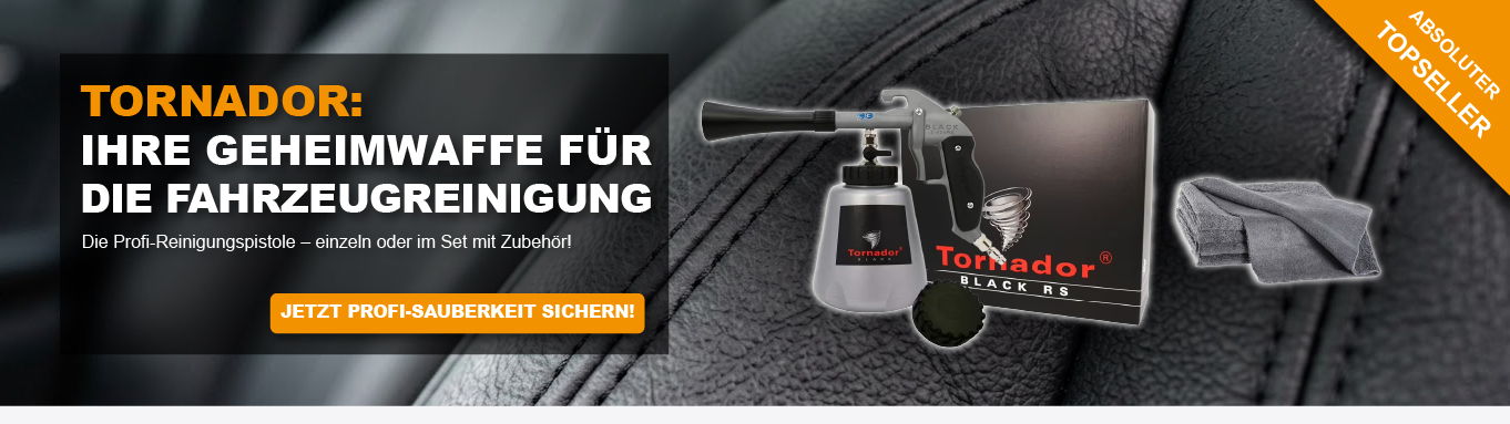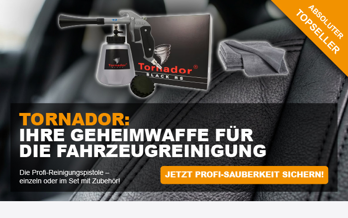 Tornador BLACK Z-020RS Reinigungspistole inkl. Zubehör Sie kommt mit noch mehr Power daher, die neue Impuls-Reinigungspistole aus der RS-Serie von Tornador®: Für eine bessere und gründlichere Reinigung und ausgelegt für den professionellen Dauereinsatz. Sie erhalten die Tornador Druckluft Reinigungspistole bei uns exklusiv im praktischen Profi-Set mit umfangreichem Tornador Zubehör und dem originalen, ultra ergiebigen 5 Liter Tornador Reinigungskonzentrat. (Ergibt im Mischverhältnis von 1:10 mit Wasser bis zu 50 Liter Reinigungsmittel mit nur 5 Litern Reinigungskonzentrat!) Ihr Tornador Set besteht aus: Tornador® Black Z-020RS REINIGUNGSPISTOLE inklusive Deckel 5 Liter ultra ergiebiges Tornador Reinigerkonzentrat Tornador BLACK Z-020RS ergonomisch, kälteisoliert und vibrationsarm für den professionellen Dauereinsatz ausgelegt noch verschleiß- und wartungsärmer optimierter Luftverbrauch = 270 l/min (bei 6 bar Druck) mit innovativer Feder Impuls-Technik für eine noch bessere Reinigungsleistung gegen extrem hartnäckige Verschmutzungen auch für Überkopfarbeiten kugelgelagerte Luftdruckverwirbelung 1 Liter Füllvolumen variable Dosierung möglich Im Zuge der Produktoptimierung wird der Regulierer nicht mehr verbaut aus widerstandsfähigem Kunststoff perfekt für PKW, LKW, Busse, Taxen, Nutzfahrzeuge und in der Industrie, Gebäudereinigung bis hin zu Anwendungsbereichen in der Luft- und Schifffahrt Das sollte Ihr Tornador Kompressor können: Benötigter Luftdruck: 6 bis max. 6,5 bar Benötigte Luftabgabemenge: mindestens 270 l/min. Bitte behalten Sie den Druckmanometer im Auge, da es zum Druckverlust kommen kann. Für 2,2kW - 240V Kolben-Kompressoren geeignet Welchen Kompressor für Tornador? Rufen Sie uns an bei Fragen, wir beraten Sie ehrlich und kompetent! Eigenschaften Ihrer Reinigungspistole Tornador: Die Profi-Reinigungspistole für PKW, LKW, Busse, Taxen und Nutzfahrzeuge, aber auch für die Industrie, Gebäudereinigung, Luft- und Schifffahrt. Tornador® BLACK Z-020RS mit innovativer Feder Impuls-Technik, neuer Ergonomie und Performance, exzellenter Haptik und kälteisolierenden und vibrationsarmen Griffschalen. Das Rotationsset ist ausgestattet mit abgedichteten Kugellagern, die die Tornador® BLACK Z-020RS in die Lage versetzen, auch mit kleinen oder mobilen Kompressoren zu arbeiten. Der Verschleiß ist minimiert, da das Rotations-Set nicht mehr mit dem Auslasstrichter in Kontakt kommt. Die zuverlässige Rotationstechnik der Tornador BLACK Z-020RS spart nicht nur Zeit und Geld, sondern zeichnet sich auch durch verringerte Geräuschemissionen und weniger Vibrationen aus. Anwendung: Einfache Maßnahmen die merklich die Lebensdauer Ihres Tornador® BLACK Z-020RS erhöhen! Das Gerät benötigt einen Luftdruck von 6 - max. 6,5 bar & eine Luftmenge von 270 Liter / Minute! Berühren Sie niemals mit der Spitze des Tornadors die zu reinigende Fläche! Andernfalls kommt es zu Beschädigungen und Garantieverlust des Geräts! Schütten Sie nach jedem Gebrauch das restliche Reinigungsmittel zurück in einen Kanister und spülen Sie den Tornador® BLACK Z-020RS für mindestens eine Minute mit klarem Wasser durch. Bei unsachgemäßer Handhabung kann keine Gewährleistung übernommen werden! Das perfekte Tornador Zubehör, im Set enthalten: 5 Liter universelles Reinigungskonzentrat Die Eigenschaften auf einen Blick: Perfekt zur Reinigung des Fahrzeuginnenraums reinigt porentief, sanft & gründlich & beseitigt hartnäckige Verschmutzungen, Flecken und Gerüche Neutralreiniger, der keine Flecken hinterlässt und Leder nicht auslaugt oder Textiloberflächen strapaziert geeignet für Polster, Textil, Kunststoff, Lack, Leder, Kunstleder und alle gummierten Oberflächen Ihres Fahrzeuges Anwendungsbereiche sind z. B. Zierleisten, Türzwischenräume, Armaturenbrett, Gummidichtungen, Lüftungsschlitze, Mittelkonsolen, Ledersitze uvm. Fahrzeuge, Teppiche, Polstermöbel, Polstersitze, Stoffverkleidungen, Dachhimmeln, Schonbezügen und Fußmatten im gesamten Fahrzeuginnenraum u. v. m. Ganz ohne Tenside, Enzyme, Bleichmittel oder Lösungsmittel! Bestens geeignet für Allergiker Mischverhältnis: 1:10 Anwendung mit dem Reinigungskonzentrat: Mischen Sie das Reinigungskonzentrat in einem Gefäß im Mischverhältnis von 1:10 mit Wasser. Dann vor Gebrauch gut schütteln und in den Behälter des Tornador Black füllen. Alternativ können Sie auch 100 ml des Reinigungskonzentrats in den Behälter der Tornador Black Pistole füllen und den restlichen Becher mit Wasser auffüllen. Fertig ist 1 ganzer Liter Reinigungsmittel! Nun können Sie mit der Reinigung beginnen. Lassen Sie die Mischung kurz auf der behandelten Fläche einwirken und wischen Sie abschließend die Überreste mit einem Mikrofasertuch, z.B. unserem High Performance, weg.
